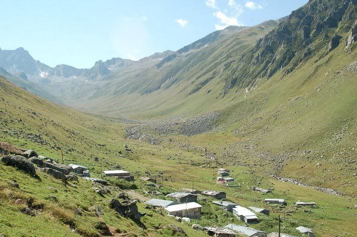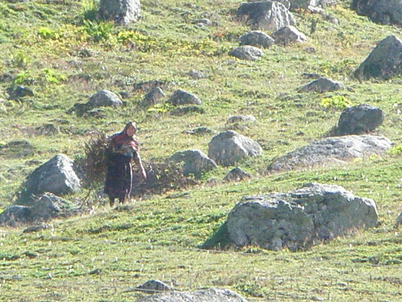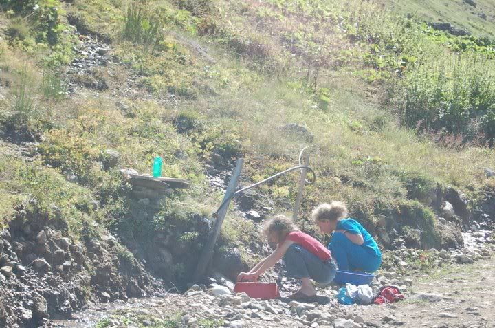 Waking up the next morning, we got ourselves packed and ready for our first real adventure-a one-day hike up to Karadeniz Guru, also know as the 'lake area' in the Kachkar Mountains. We passed by the bakery again and picked up another Ramazan bread, some cheese, chocolate, and water for our lunch and hopped on another dolmus (15YTL) to take us to Yukari Kavrun. It's an even smaller and more remote village than Ayder, at the base of the Kachkar. Here is a place where old ladies collect firewood for the stove and knit wool socks with funky patterns, men chop wood and fix up houses, and kids play with baby chicks; tin roofs are weighed down with rocks, and drinking water comes directly from a waterfall. Very simple and very pure.